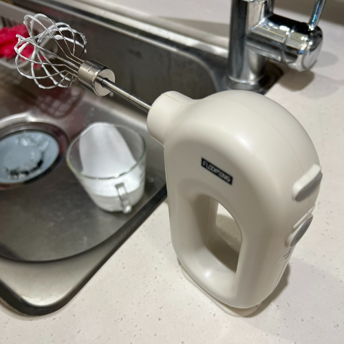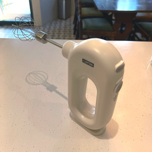 보통 집에서 베이킹하실 때는 날 두 개 달린 휘핑기를 많이 사용하시죠? 장점은 힘이 좋다는 것이지만, 단점으로는 무겁다, 소량을 하기엔 힘이 너무 과할 때가 있다. 소리가 너무 크다. 가장 큰 단점은 전원선이 있다는것 입니다.