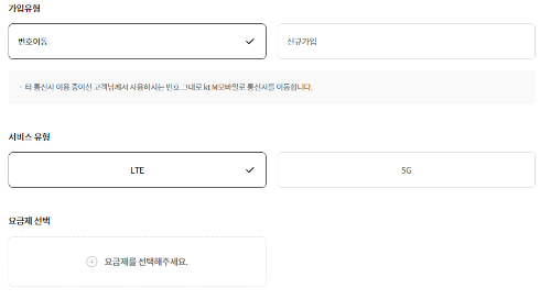 번호 이동인지 신규가입인지 선택을 해주시고, LTE 혹은 5G를 선택해 주세요.