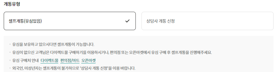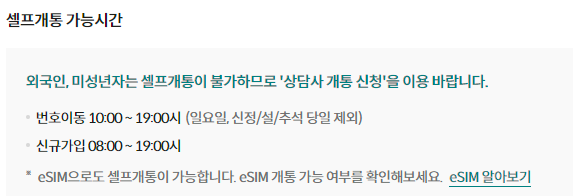 개통가능시간과 고객센터운영시간을 확인하고 가입진행을 하는게 좋습니다. 고객센터운영시간은 간혹 안되거나 문제가 생겼을 경우 바로 도움을 받을 수 있기 때문에 알아두어야 합니다. 셀프개통이 자신이 없다면 상담사 개통신청을 클릭하세요!